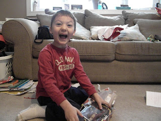 He was very excited about getting the Wii, just not too thrilled that I was holding up the gift unwrapping by making him pose for pictures.